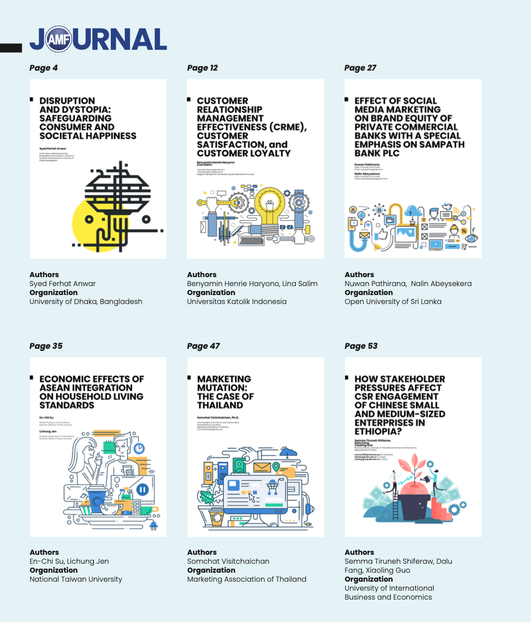 The main objectives of the AMF Journal are to further develop a body of knowledge, art and science of marketing theory and practice and increase the regional network of marketing thought leaders and help liaise with other international, national and local organizations for complementary purposes.