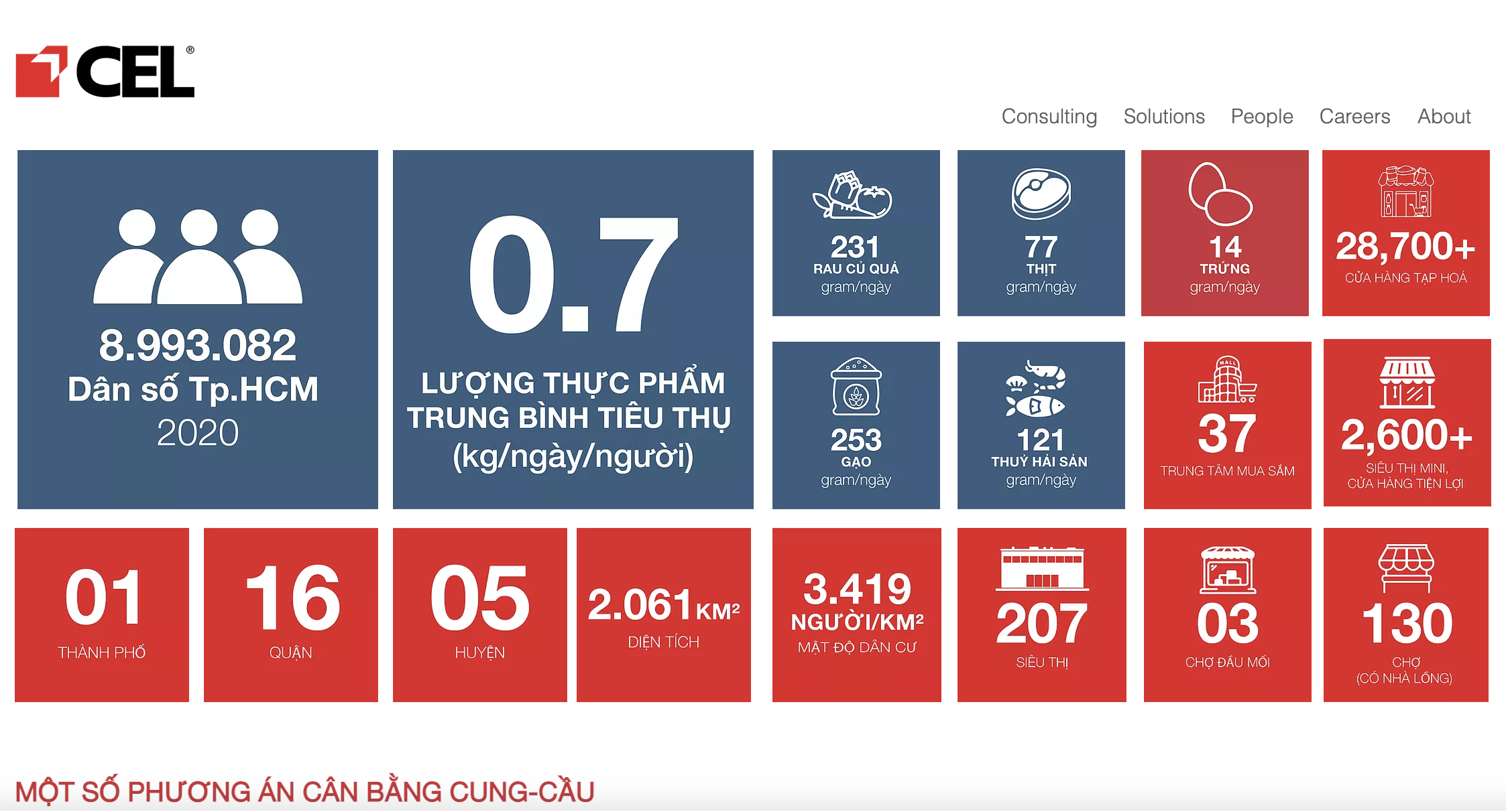 Ông Julien Brun, Tổng Giám Đốc CEL, chia sẻ “Bất kể mức độ lo lắng hay lạc quan của chúng ta như thế nào, điều quan trọng là phải nhắc nhở bản thân rằng những đối tượng yếu thế trong chúng ta sẽ phải chịu ảnh hưởng nhiều nhất. Tinh thần đoàn kết là những gì chúng ta còn lại để cùng nhau trở nên mạnh mẽ hơn khi đại dịch đi qua.” Rất nhiều người đang gặp khó khăn giữa đại dịch Covid trong việc tìm kiếm nguồn cung và đáp ứng những nhu cầu hàng ngày. Nguồn cung thường bị hạn chế, rất nhiều chợ hoặc cửa hàng đã buộc phải đóng cửa. Một số khu vực bị ảnh hưởng nặng nề hơn những nơi khác. Đội ngũ CEL mong muốn đóng góp chuyên môn Quản Trị Cung Ứng và Khoa Học Dữ Liệu để cung cấp đến người dân cũng như các chuyên gia thông tin hữu ích có tính phân tích khoa học từ dữ liệu, từ đó giúp ứng phó với thách thức về nhu cầu và cung ứng cho những mặt hàng thiết yếu tại TP.HCM. Hiện tại, “hàng thiết yếu” đơn giản được hiểu là thực phẩm. Tuy nhiên, CEL có thể sẽ mở rộng dữ liệu sang lĩnh vực thiết yếu khác như nước uống, y tế trong những ngày tới. CEL chọn bắt đầu với TP.HCM vì đây là địa phương đang đối mặt với nhiều thách thức cung cầu nhất trong đợt dịch này. Dữ liệu sử dụng được tổng hợp từ nhiều nguồn như Bộ Y tế, UBND TP.HCM, Tổng cục Thống kê, Bộ Công Thương, Bộ Nông nghiệp và Phát triển Nông thôn, và tra soát dữ liệu thực tế từ CEL. Tất cả nguồn thông tin đều minh bạch. CEL cập nhật liên tục hàng ngày để đảm bảo có được những thông tin mới nhất.