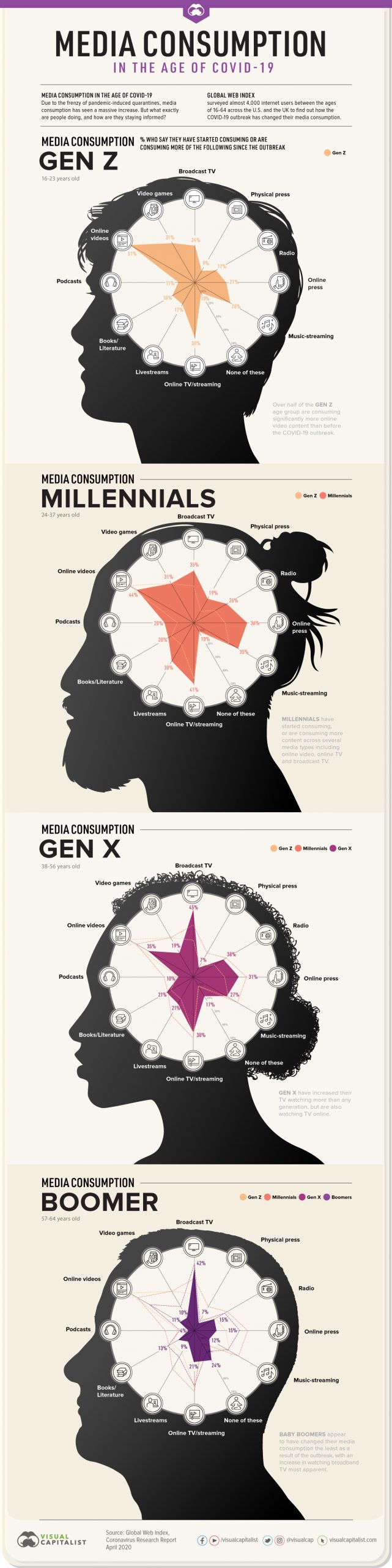 During this period of pandemic-induced social isolation, it’s no surprise that people are consuming vast amounts of media. Today’s graphics use data from a Global Web Index report to explore how people have increased their media consumption as a result of the outbreak, and how it differs across each generation.