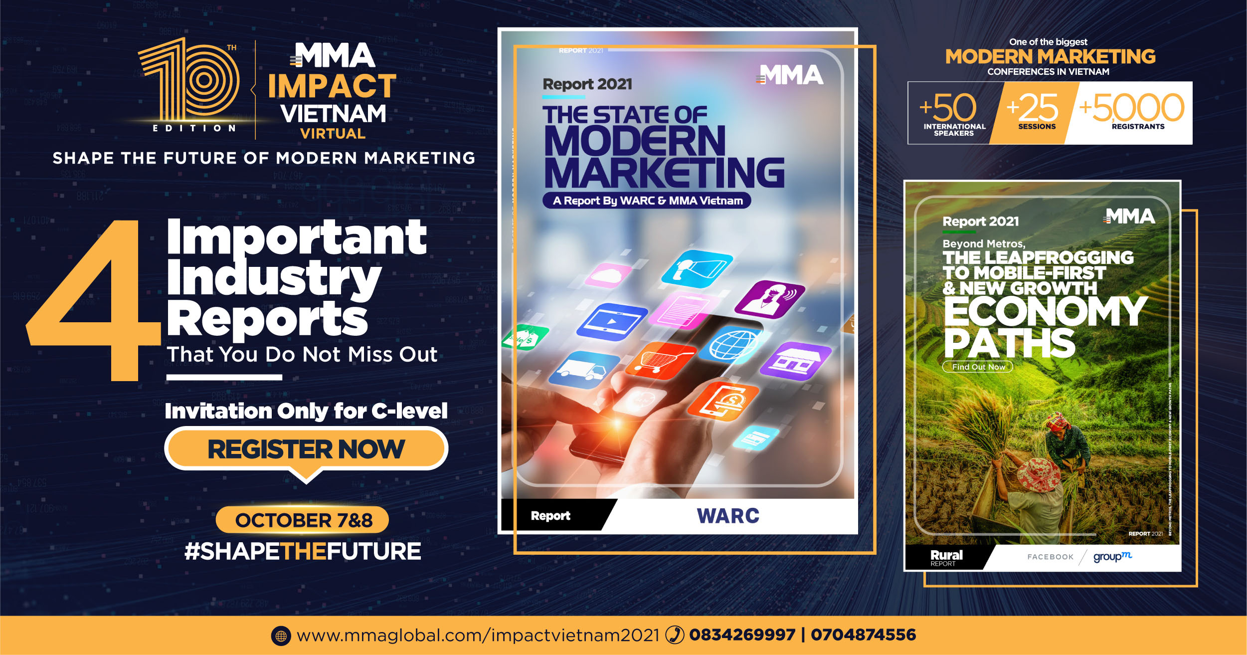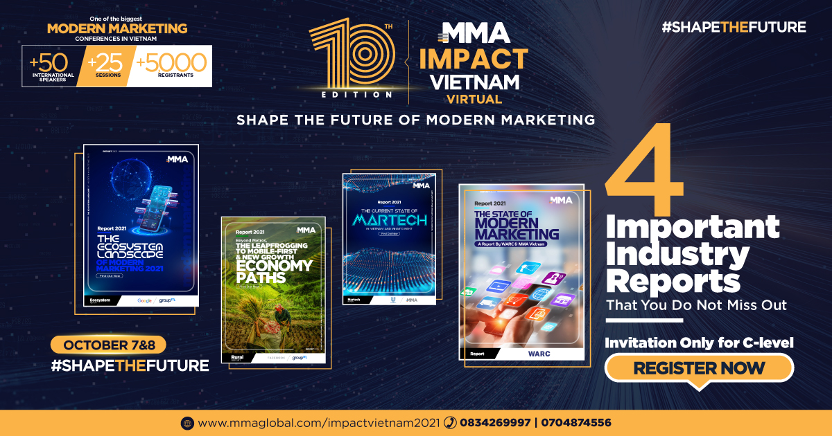 Cụ thể, tại sự kiện MMA Impact Vietnam Virtual diễn ra trong hai ngày 7&8 tháng 10, MMA Việt Nam cùng Ban điều hành sẽ công bố 4 Báo cáo quan trọng được mong đợi nhất năm. Bao gồm: Báo cáo về hệ sinh thái Modern Marketing; Báo cáo về thị trường tiếp thị số nông thôn; Báo cáo về hệ sinh thái Martech tại Việt Nam; Báo cáo về tổng quan Mobile Marketing do đối tác toàn cầu Warc thực hiện cùng MMA APAC.