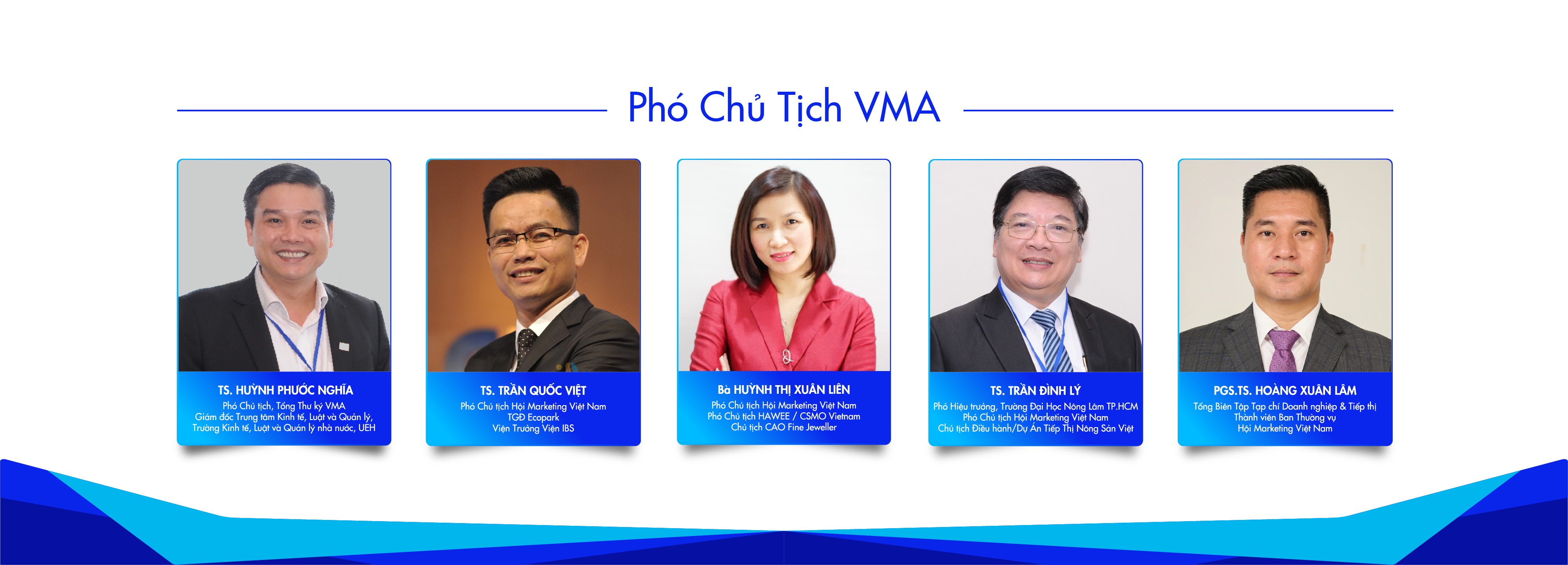 Ban chấp hành VMA nhiệm kỳ V (2024-2029) gồm 27 thành viên là các chuyên gia, nhà tiếp thị giàu kinh nghiệm trong các lĩnh vực ngành nghề tiếp thị kinh doanh đa dạng, trong đó có nhiều hội viên tập thể như: Trường Đại học Kinh tế Quốc dân, Đại học UEH, Trường Kinh doanh, Khoa Kinh doanh quốc tế Marketing, Trường Đại học Nông Lâm TP.Hồ Chí Minh, Trường Đại học Văn Lang, Học viện Tài chính Bộ tài chính, Viện IBS, Viện nghiên cứu Phát triển Thừa Thiên Huế, Viện Kỷ lục Việt Nam, HTV Khoa Giáo; đại diện cộng đồng CSMO, các thành viên BCH cũng đến từ các công ty, nhà tiếp thị như: An Cường, Grab Vietnam, Havas Group Vietnam, Công ty CP Hàng tiêu dùng Biên Hoà TTC, Tập đoàn Thiên Long, Hoa Sen Group, Nước Mắm Liên Thành, Hoàng Lam, SunHouse Group, Tạp chí Doanh nghiệp và Tiếp thị, Syngenta Vietnam, VietGuys, Vietnam Brand Purpose, TMDV Chỉ số Nông nghiệp, Món ngon miền Tây, VietnamMarcom.