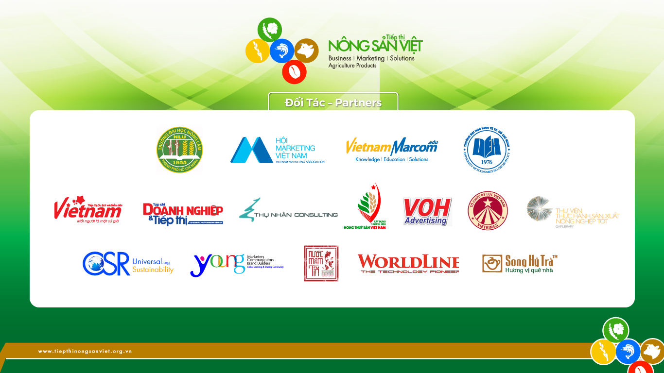 Hội Marketing Việt Nam, Trường Đại Học Nông Lâm TP.HCM, Đại Học Kinh tế TP.HCM, VietnamMarcom và 15 đối tác cùng đồng hành hỗ trợ, xây dựng phát triển tổ chức Tiếp Thị Nông Sản Việt (TTNSV).