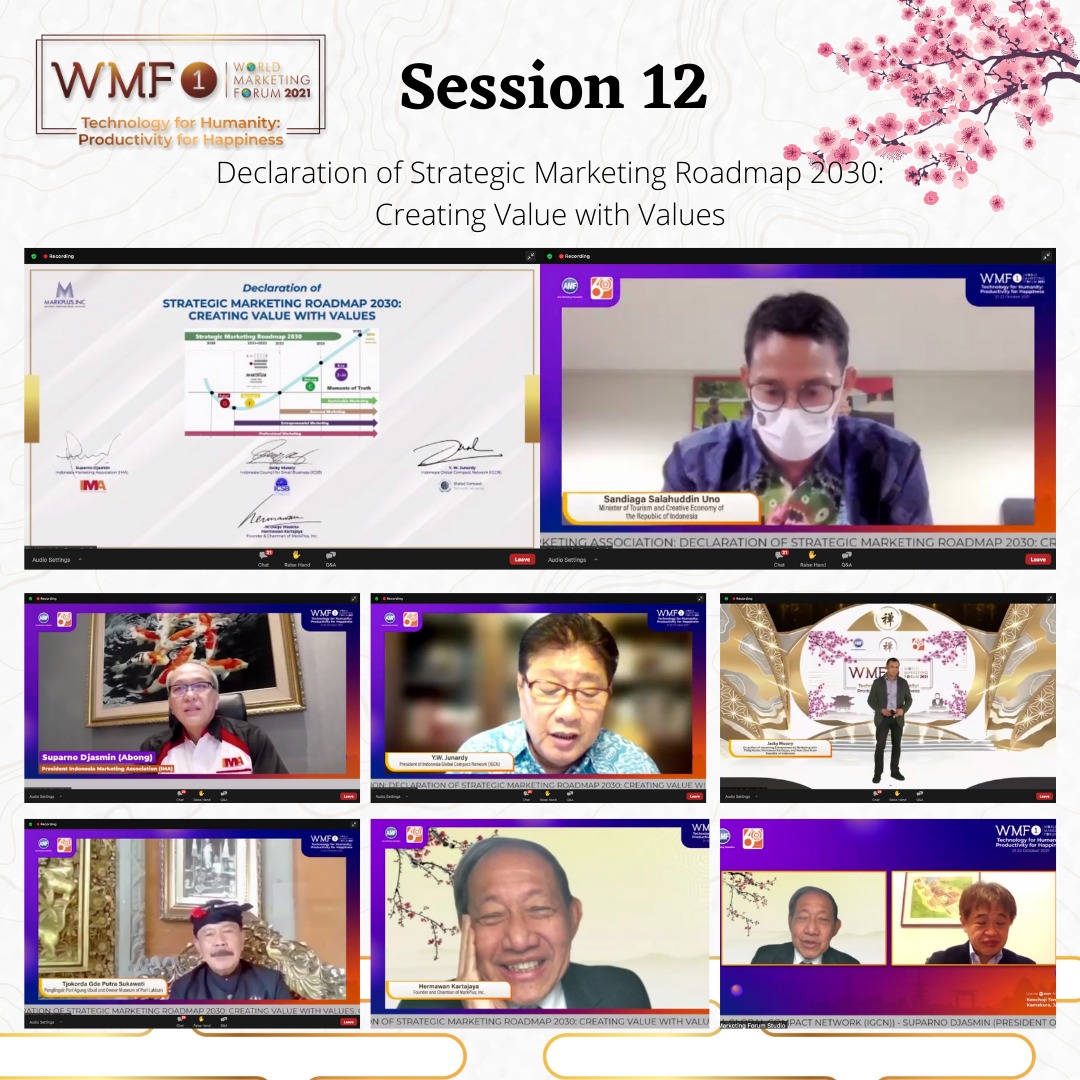 On the second day of the World Marketing Forum (WMF) 2021, Sandiaga Uno, the Minister of Tourism and Creative Economic Minister, was present to close this marketing forum in session 12. Suparno Djasmin opened this last session as the incumbent President of the Indonesia Marketing Association (IMA), Y.W. Junardy as President of Indonesia Global Compact Network (IGCN), Jacky Mussry as Co-author of upcoming Entrepreneurial Marketing with Philip Kotler, Hermawan Kartajaya, and Hooi Den Huan, Tjokorda Gde Putra Anak Agung Sukawati as King of Ubud, Bali, Sadayoshi Fujishige as President of Japan Marketing Association, and Hermawan Kartajaya as Co-founder of World Marketing Forum and Honorary Founding Chairman of Indonesia Marketing Association.