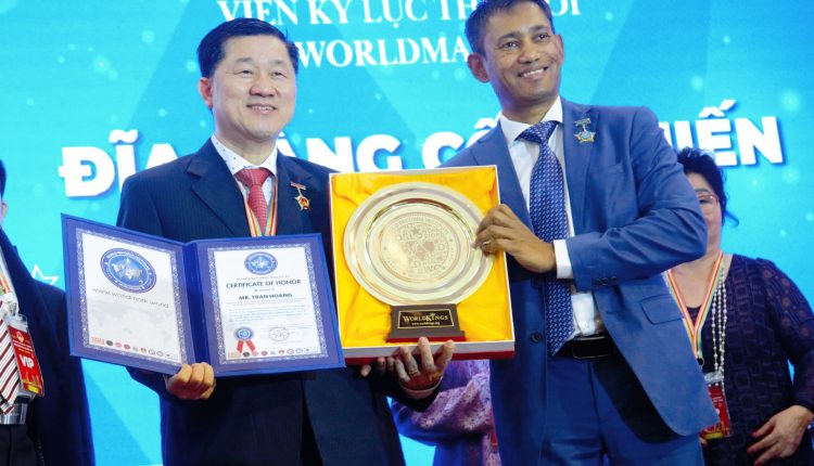 Tiến sĩ Biswaroop Roy Chowdhury Chủ tịch Liên Minh Kỷ Lục Thế Giới trao chứng nhận và Đĩa vàng Cống hiến đến ông Trần Hoàng. (ảnh: VietKings)